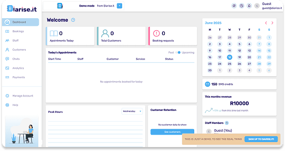 With built-in features like payment processing, customer messaging, and a detailed financial dashboard, Diarise.it helps you cut out the chaos, eliminate no-shows, and turn admin headaches into seamless, automated processes. It's the modern solution for service providers who want to elevate their brand, streamline operations, and scale up without stress.