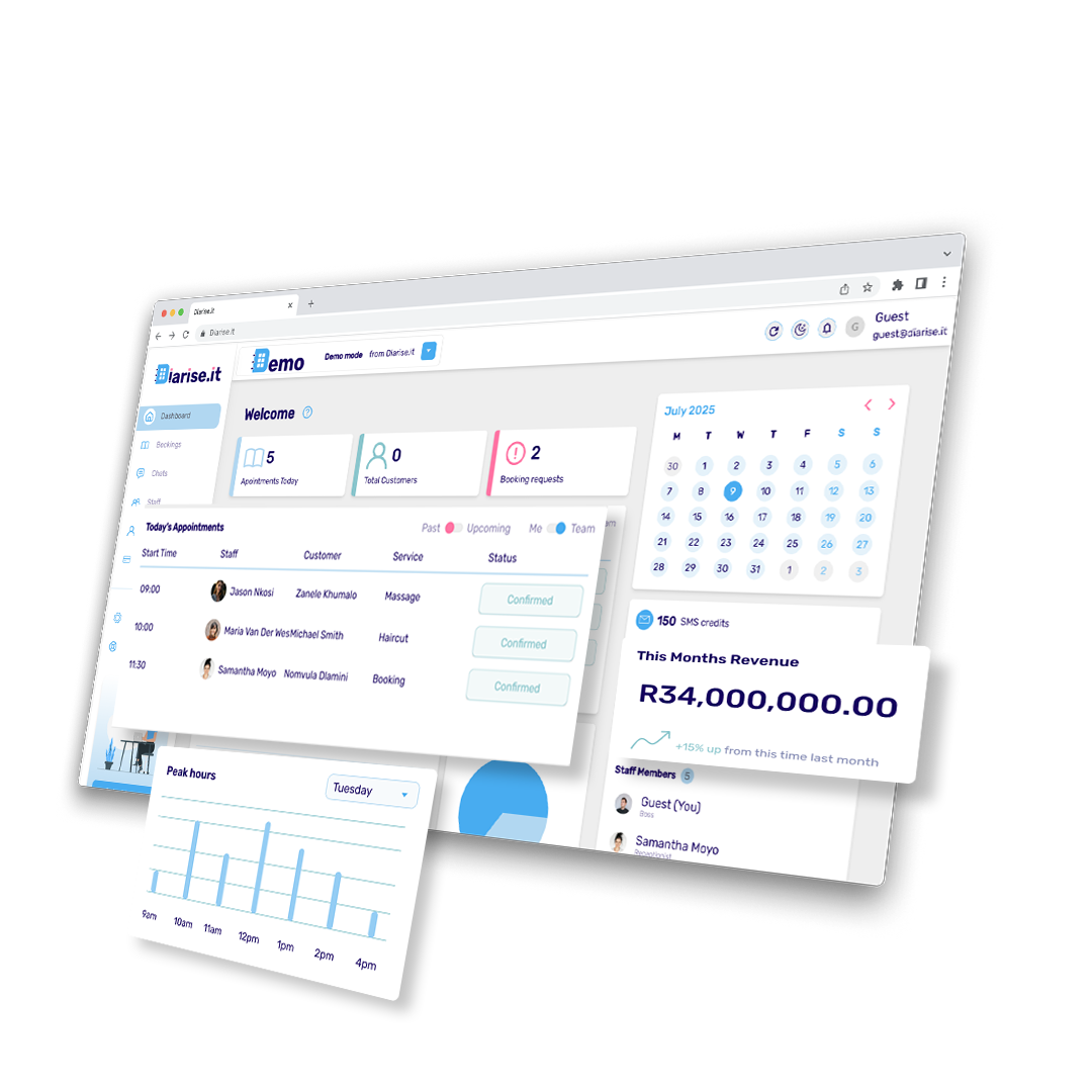 Forget paper diaries and scattered spreadsheets. Diarise.it’s smart dashboard pulls everything together so you can manage your business effortlessly. From viewing upcoming appointments and checking client histories to analysing sales trends and tracking daily income, the dashboard is designed to save time and support data-driven decisions.
