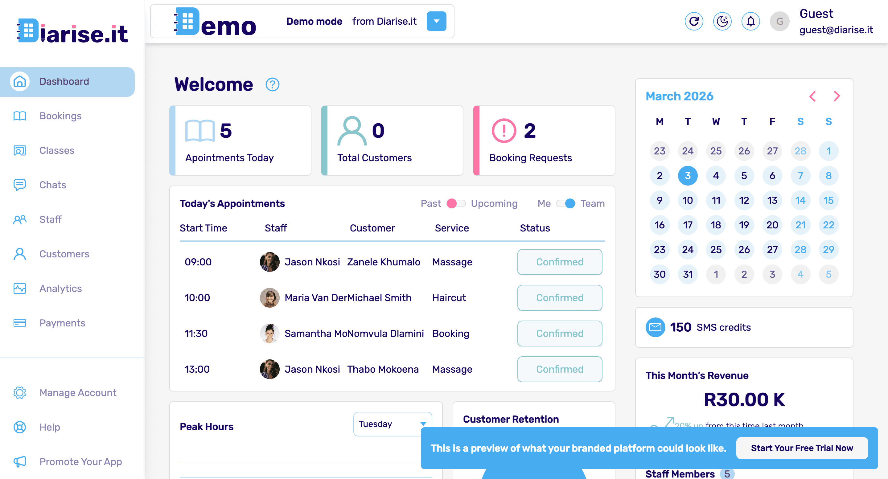With built-in features like payment processing, customer messaging, and a detailed financial dashboard, Diarise.it helps you cut out the chaos, eliminate no-shows, and turn admin headaches into seamless, automated processes. It's the modern solution for service providers who want to elevate their brand, streamline operations, and scale up without stress.